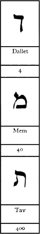 Mem (ponder Meme here), is water, Mem~Mem is divine water of waters a(ny) place(ings) (see Cratylus) where its antinomialq (do n¤t use 'oppositec' here) Dallet, is borne. Also fathom how 'waters' elsewhere refer humanity. Doug - 3Jan2014. Doug issi quantum~paraphrasing Suares in his Song of Songs, p.17, Shambala, 1972. |