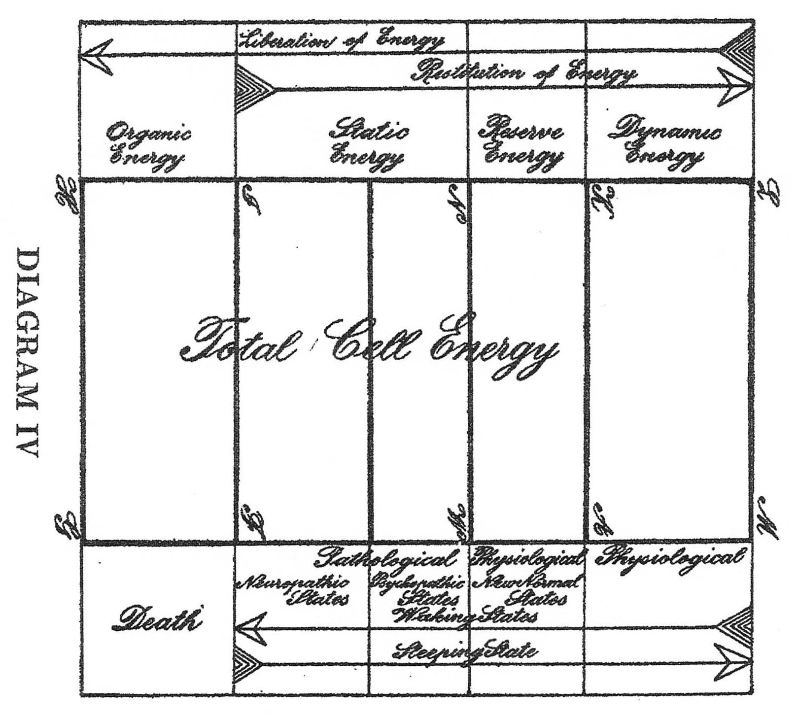 | 335 | 11 | Should the process of liberation of energy go on further without restitution, the energy drawn is taken from the lower levels of static energy, and the symptoms are functional, neuropatltic. The lowermost levels of static energy are the last the cell can dispense with to save itself from total destruction. With further increase of discharge of energy the cell must give its very life activity, the energy is drawn from the breaking up of cell tissue; this energy is organic or necrotic. |